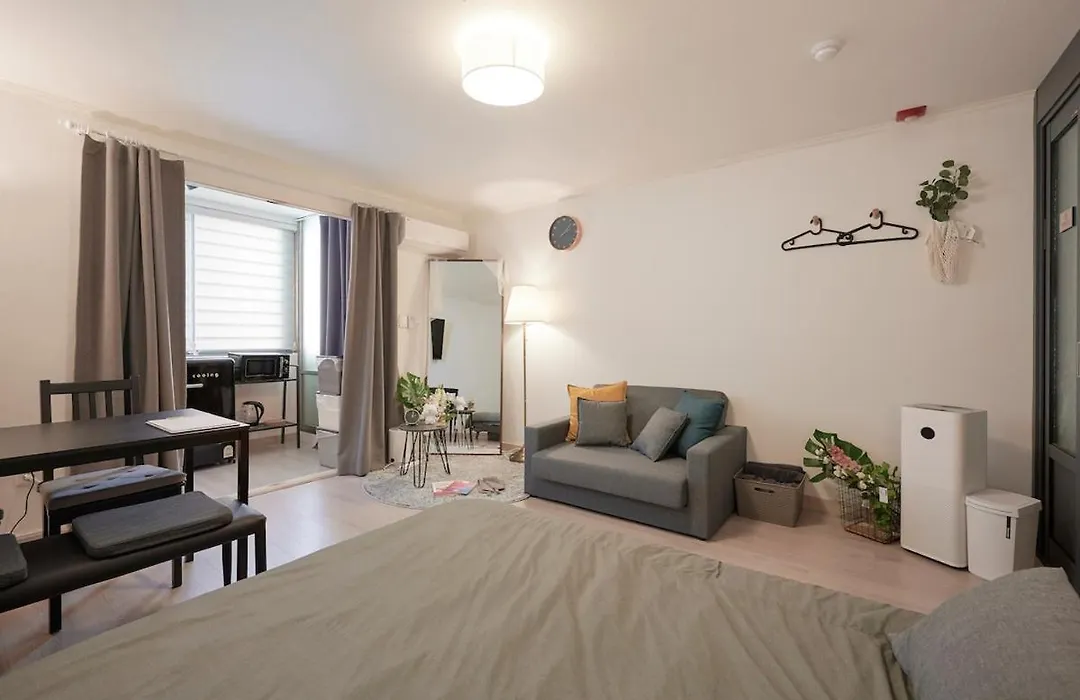 Den här lägenheten har ett utrustat kök, komplett med vattenkokare, kylskåp och glas för din bekvämlighet. Den närmaste tunnelbanestationen Sangsu är belägen mindre än 5 minuters promenad bort.